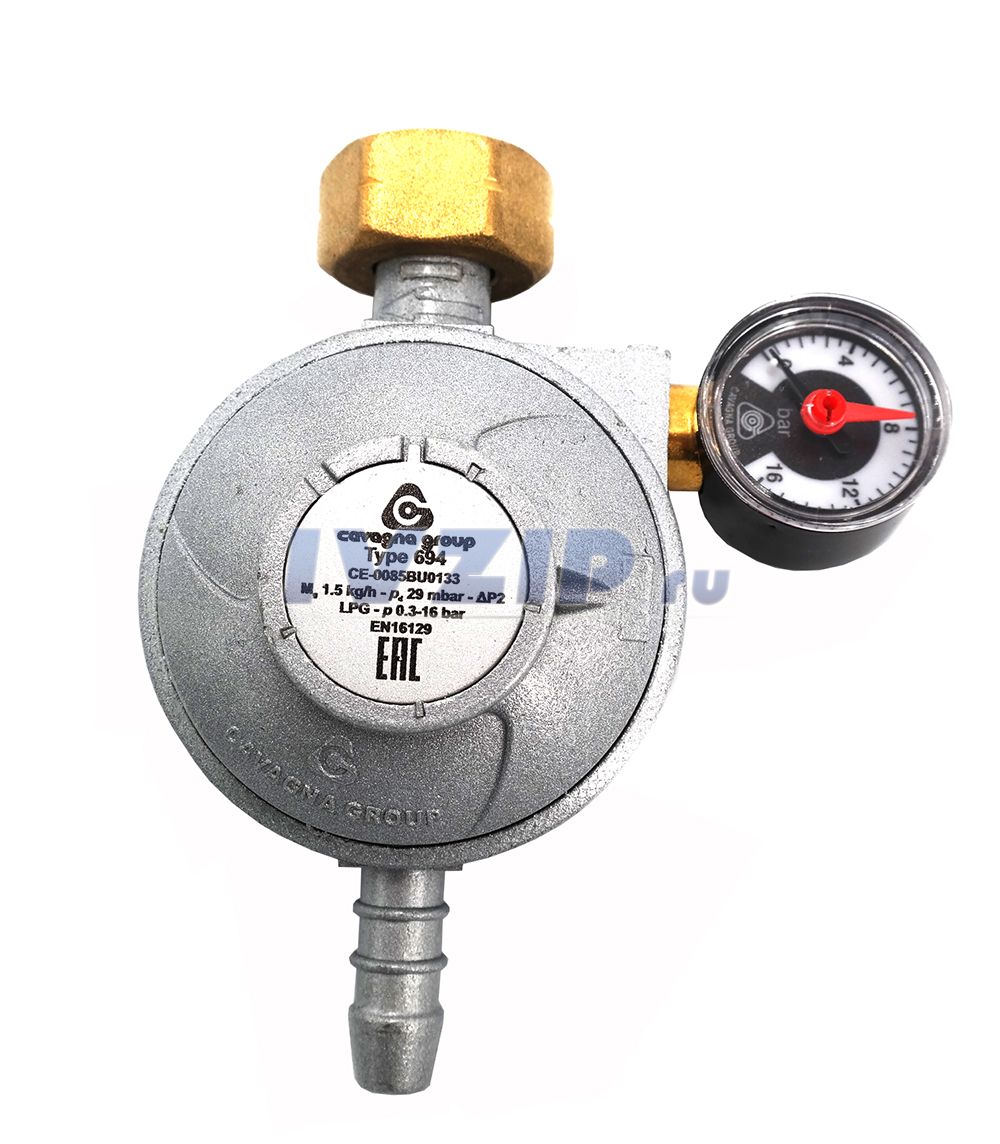 Регулятор давления Лягушка CAVAGNA GROUP694, Италия с манометром, инд.утечки, 29mbar, 1,5кг/ч, соед.вх.W21,8x1/14LH, вых.штуцер 12мм (6914900159)
